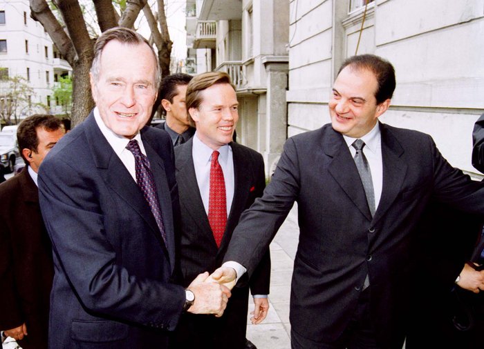 Στις 3 Απριλίου του 2001 ο Κώστας Καραμανλής υποδέχεται στη Ρηγίλλης τον Τζόρτζ Μπους τον πρεσβύτερο, συνοδευόμενο από τον τότε πρεσβευτή Νίκολας Μπερνς.