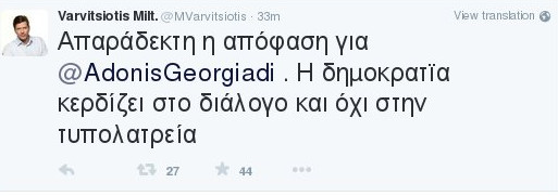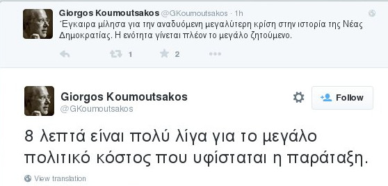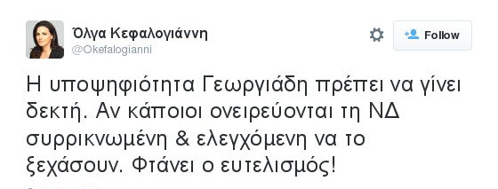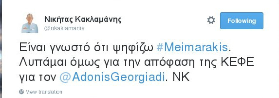 Με αναρτήσεις τους στο twitter, ο Απόστολος Τζιτζικώστας, ο Κυριάκος Μητσοτάκης, η Ολγα Κεφαλογιάννη, ο Νικήτας Κακλαμάνης, ο Γιώργος Κουμουτσάκος, ο Μιλτιάδης Βαρβιτσιώτης και πολλοί άλλοι έσπευσαν να εκφράσουν την αντίθεσή τους στην απόφαση της Κεντρικής Εφορευτικής Επιτροπής της ΝΔ.