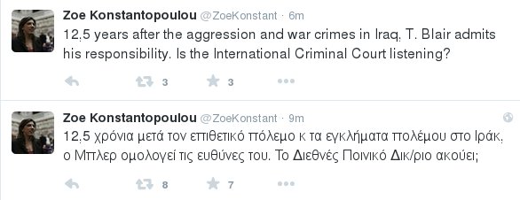 «12,5 χρόνια μετά τον επιθετικό πόλεμο και τα εγκλήματα πολέμου στο Ιράκ, ο Μπλερ ομολογεί τις ευθύνες του. Το Διεθνές Ποινικό Δικαστήριο ακούει;», έγραψε η πρώην πρόεδρος της Βουλής, στο λογαριασμό της στο Twitter.