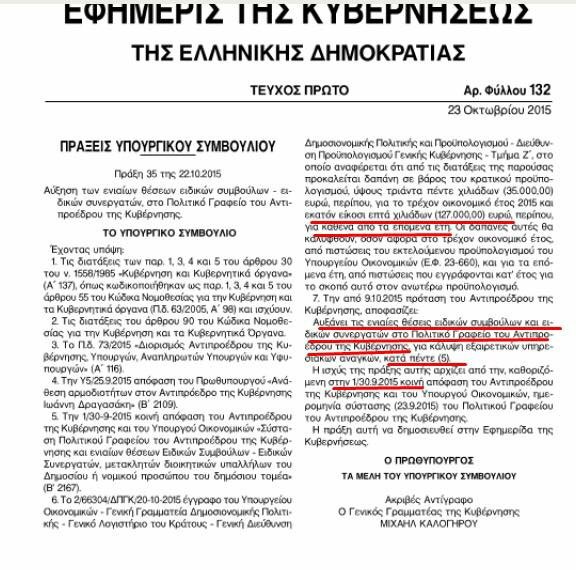 Σε αυτό, αναφέρεται- και το έχει υπογραμμίσει ο κ. Μητσοτάκης- η απόφαση να αυξηθούν κατά πέντε οι ενιαίες θέσεις ειδικών συμβούλων και ειδικών συνεργατών στο πολιτικό γραφείο του αντιπροέδρου της κυβέρνησης, για την κάλυψη εξαιρετικών υπηρεσιακών αναγκών.
