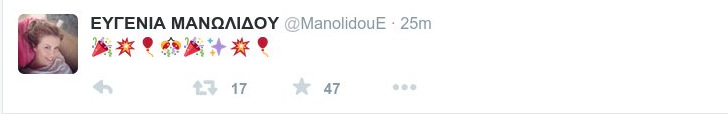 Η μαέστρος δεν μπόρεσε να κρύψει την χαρά της για το γεγονός και έκανε ένα tweet με μπαλόνια, πυροτεχνήματα και αστέρια.
