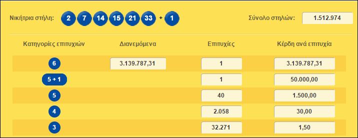 Το τυχερό δελτίο παίχτηκε στην Κέρκυρα, ενώ ένα τυχερό δελτίο στη δεύτερη κατηγορία (5+1) που παίχτηκε στον Πειραιά κερδίζει 50.000 ευρώ.