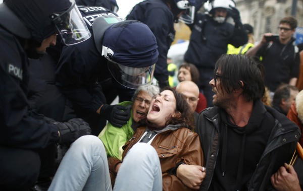 Εναντίον τους διαδήλωσαν περίπου 600 μέλη αριστερών οργανώσεων, ενώ σημειώθηκαν προπηλακισμοί μεταξύ των τελευταίων και της αστυνομίας.