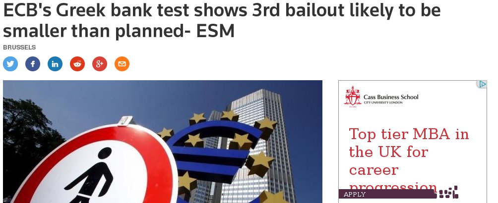 Τα αποτελέσματα των stress tests για τις ελληνικές τράπεζες, τα οποία ανακοίνωσε η ΕΚΤ το Σάββατο, και το γεγονός πως οι κεφαλαιακές ανάγκες των ελληνικών τραπεζών έδειξαν μικρότερη ανάγκη ανακεφαλαιοποίησης, σημαίνει ότι ίσως δεν χρειαστούν και τα 86 δισ. ευρώ του δανείου, σύμφωνα με τον Ευρωπαϊκό Μηχανισμό Σταθερότητας (ΕSM).