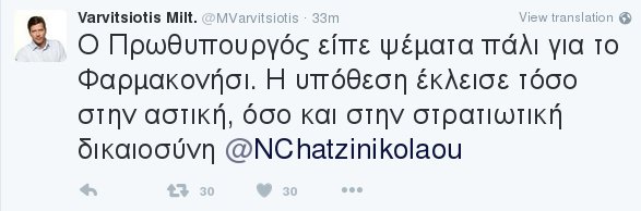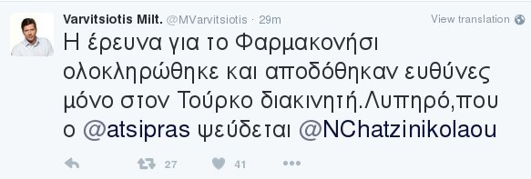 «Ο πρωθυπουργός είπε ψέματα πάλι για το Φαρμακονήσι. Η υπόθεση έκλεισε τόσο στην αστική, όσο και στην στρατιωτική δικαιοσύνη», έγραψε αρχικά στον λογαριασμό του στο Twitter ο κ. Βαρβιτσιώτης και πρόσθεσε λίγο αργότερα με νέα ανάρτηση «Η έρευνα για το Φαρμακονήσι ολοκληρώθηκε και αποδόθηκαν ευθύνες μόνο στον Τούρκο διακινητή. Λυπηρό που ο Αλέξης Τσίπρας ψεύδεται».